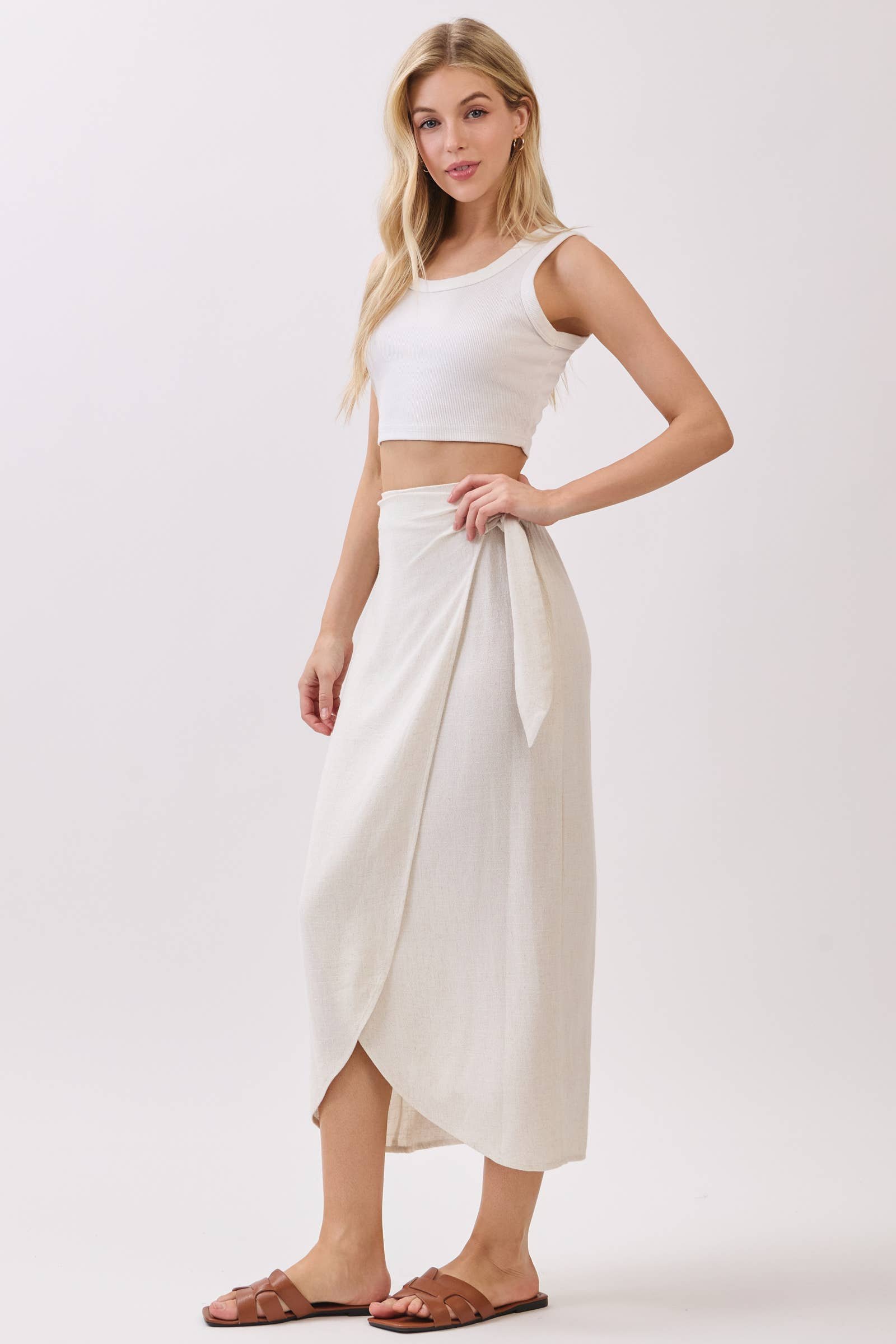 SIDE TIE WITH ROUND HEM DETAILED WRAP MIDI SKIRT.