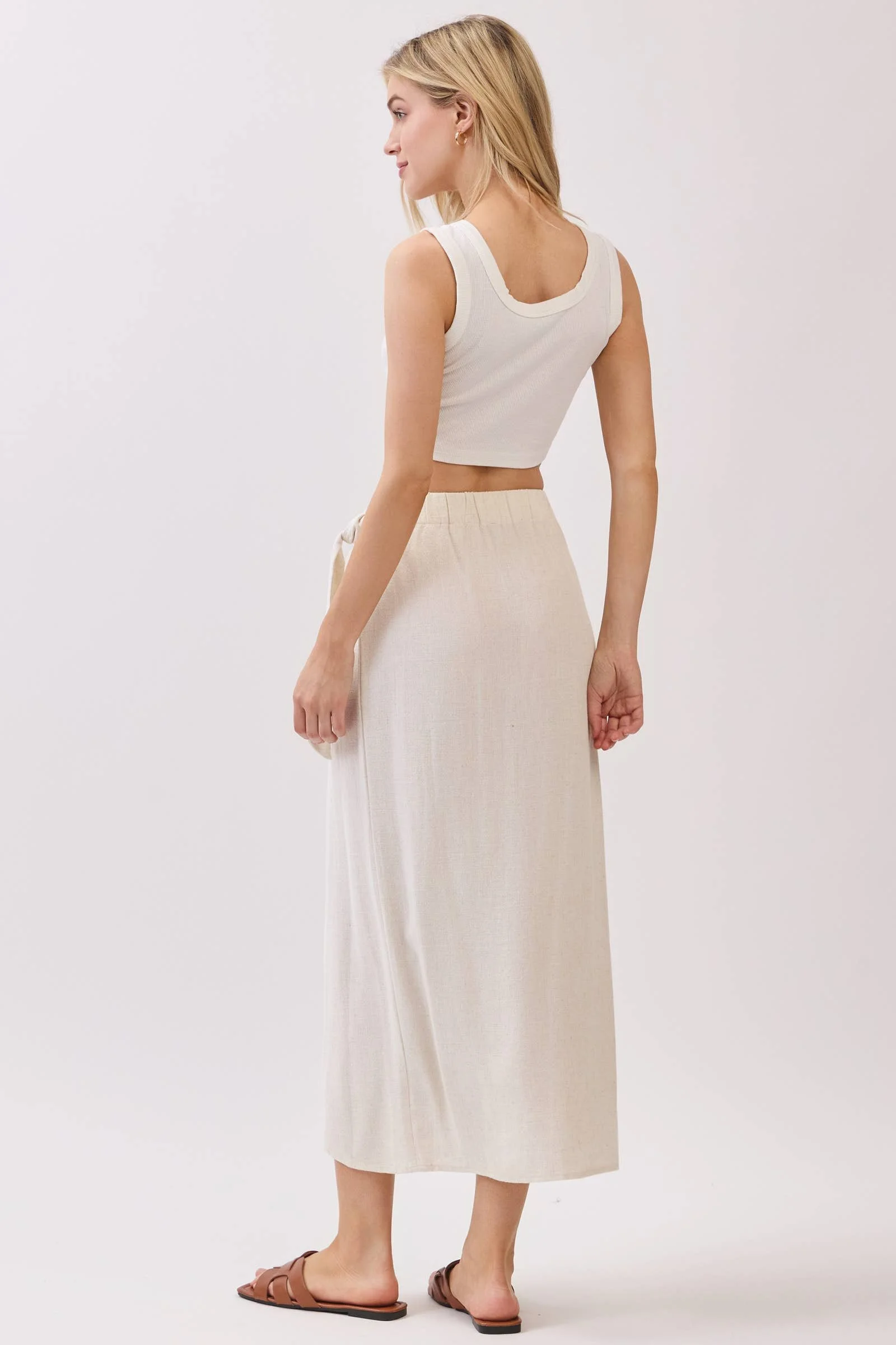 All Items › Side Tie Wrap Skirt Oatml,L Image 1 of 5 Image 2 of 5 Image 3 of 5 Image 4 of 5 Image 5 of 5 Side Tie Wrap Skirt Oatml,L $60.00 Limited Availability SIDE TIE WITH ROUND HEM DETAILED WRAP MIDI SKIRT. 70% RAYON 30% LINEN Get notified by email when this product is in stock. Add To Cart Added! SIDE TIE WITH ROUND HEM DETAILED WRAP MIDI SKIRT. 70% RAYON 30% LINEN