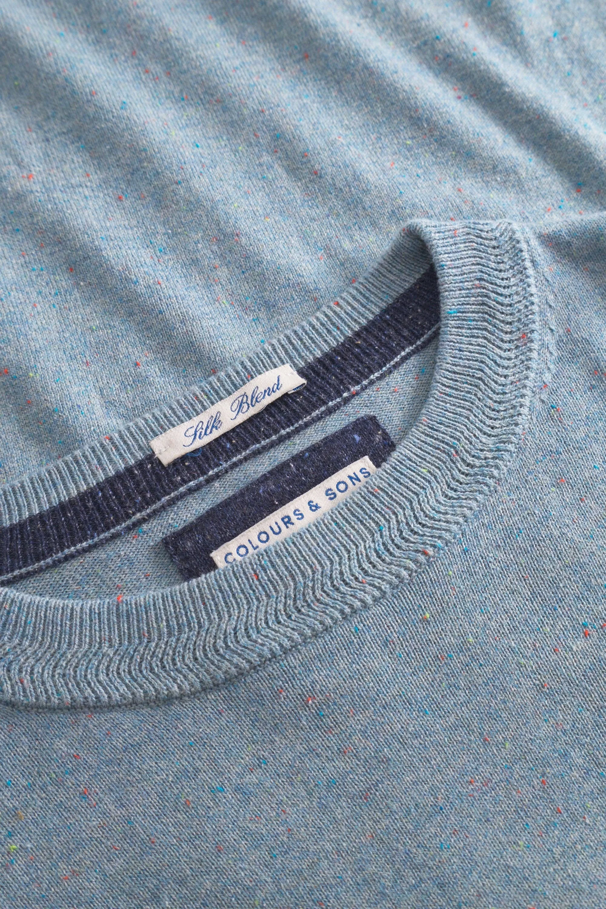 Lightweight basic sweater for men made from a cotton-silk blend. Zigzag pattern on collar, cuffs on sleeves and hem, contrasting color on the inside, logo on the hem.