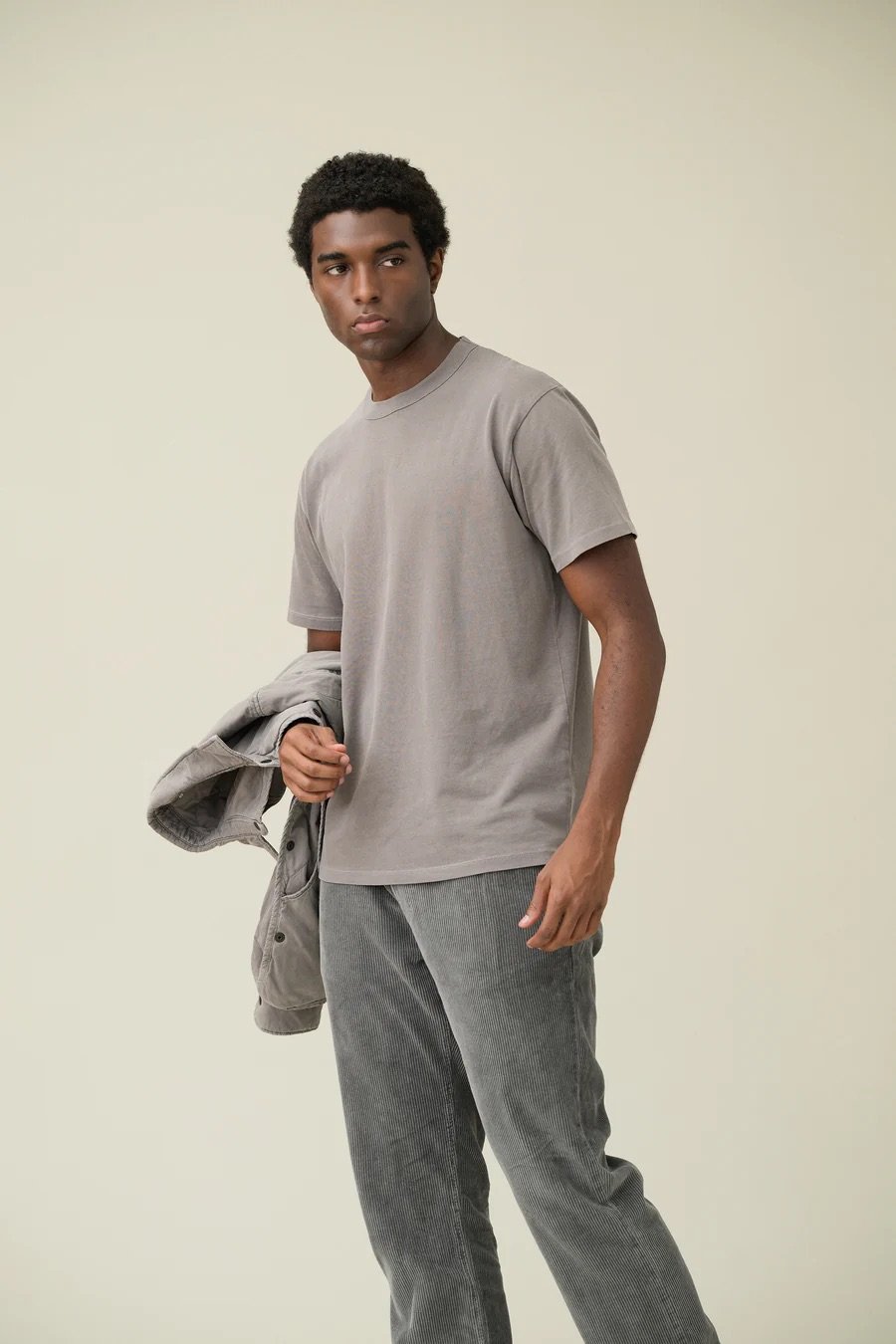 This recycled cotton quality is a blend of virgin cotton and upcycled cotton from the scraps salvaged from cutting tables in the factory. With the combination of the heavier weight recycled cotton quality and pigment dye process, this tee has an uneven high low that is more textural than our other tees. This tee is in SKU Athletic Fit, which is a boxy fit. 50% cotton 50% recycled cotton. Bound rib collar crew neck. Pre -shrunk/pigment dyed. Heavier weight cotton quality. Made in USA of Imported Yarn. Our model Anselmo is 6'1" with broad shoulders. He is wearing size L tees.