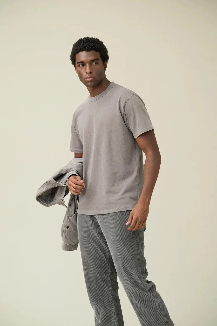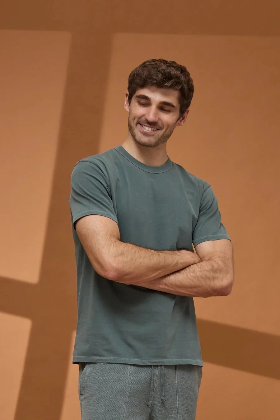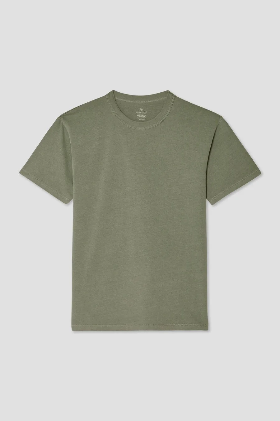 S K U - Save Khaki United This recycled cotton quality is a blend of virgin cotton and upcycled cotton from the scraps salvaged from cutting tables in the factory. With the combination of the heavier weight recycled cotton quality and pigment dye process, this tee has an uneven high low that is more textural than our other tees. This tee is in SKU Athletic Fit, which is a boxy fit. 50% cotton 50% recycled cotton. Bound rib collar crew neck. Pre-shrunk/pigment dyed. Heavier weight cotton quality. Made in USA of Imported Yarn. Our model Anselmo is 6'1" with broad shoulders. He is wearing size L tees.