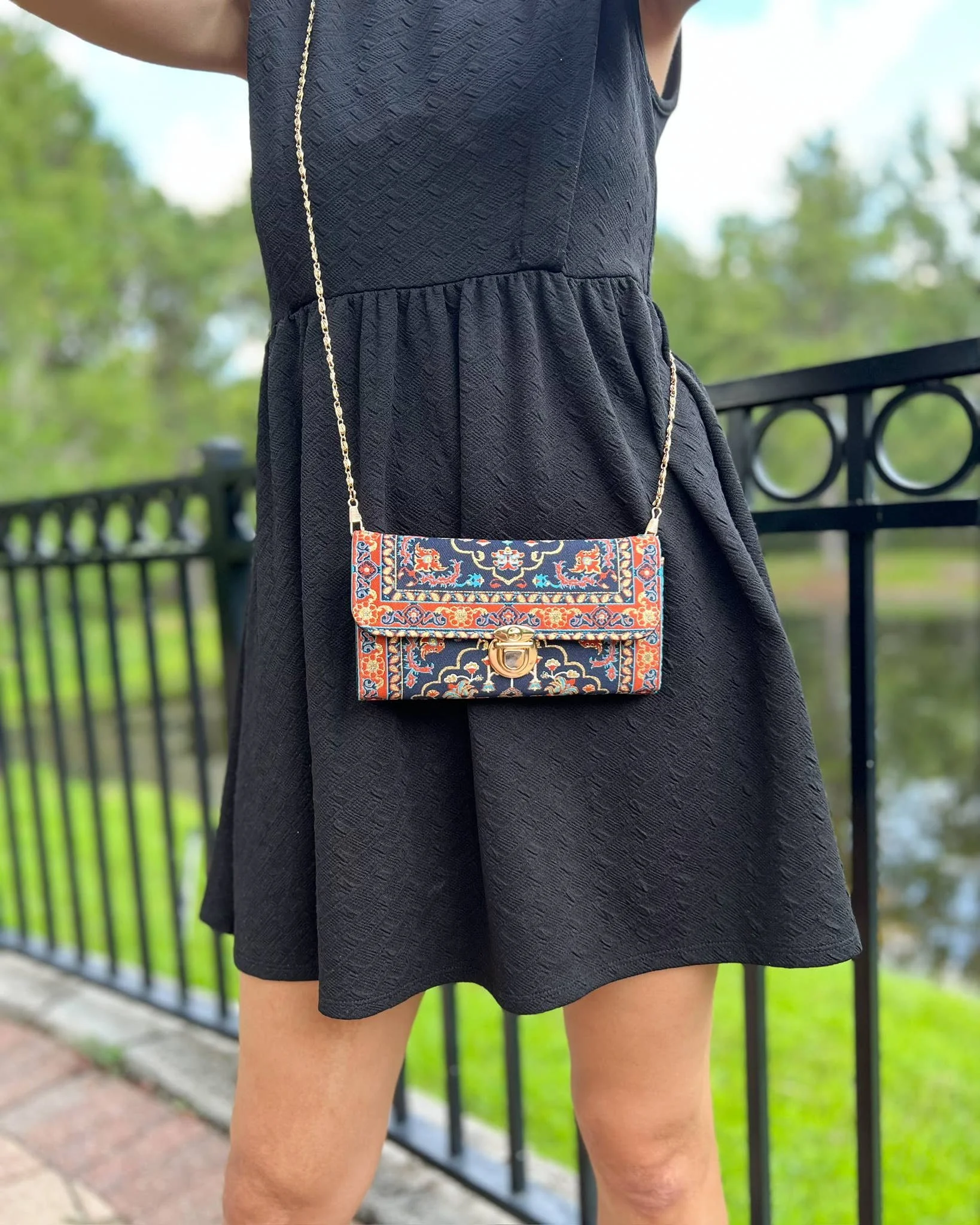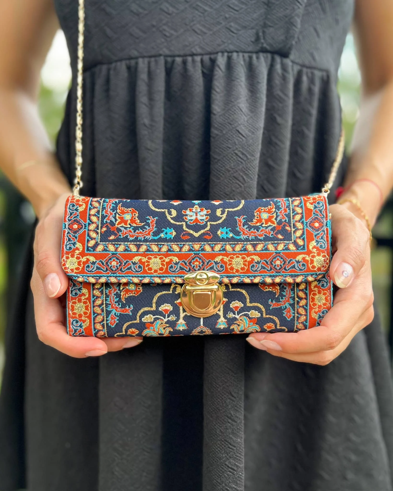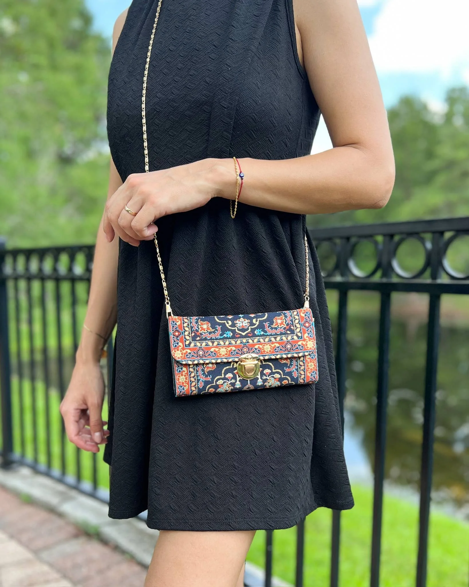 This Boho crossbody bag is made of Turkish carpet patterned brocade fabric and vegan leather. It has a metal clasp and metal chain. It can be used as a trifold wallet when you take the chain out.
