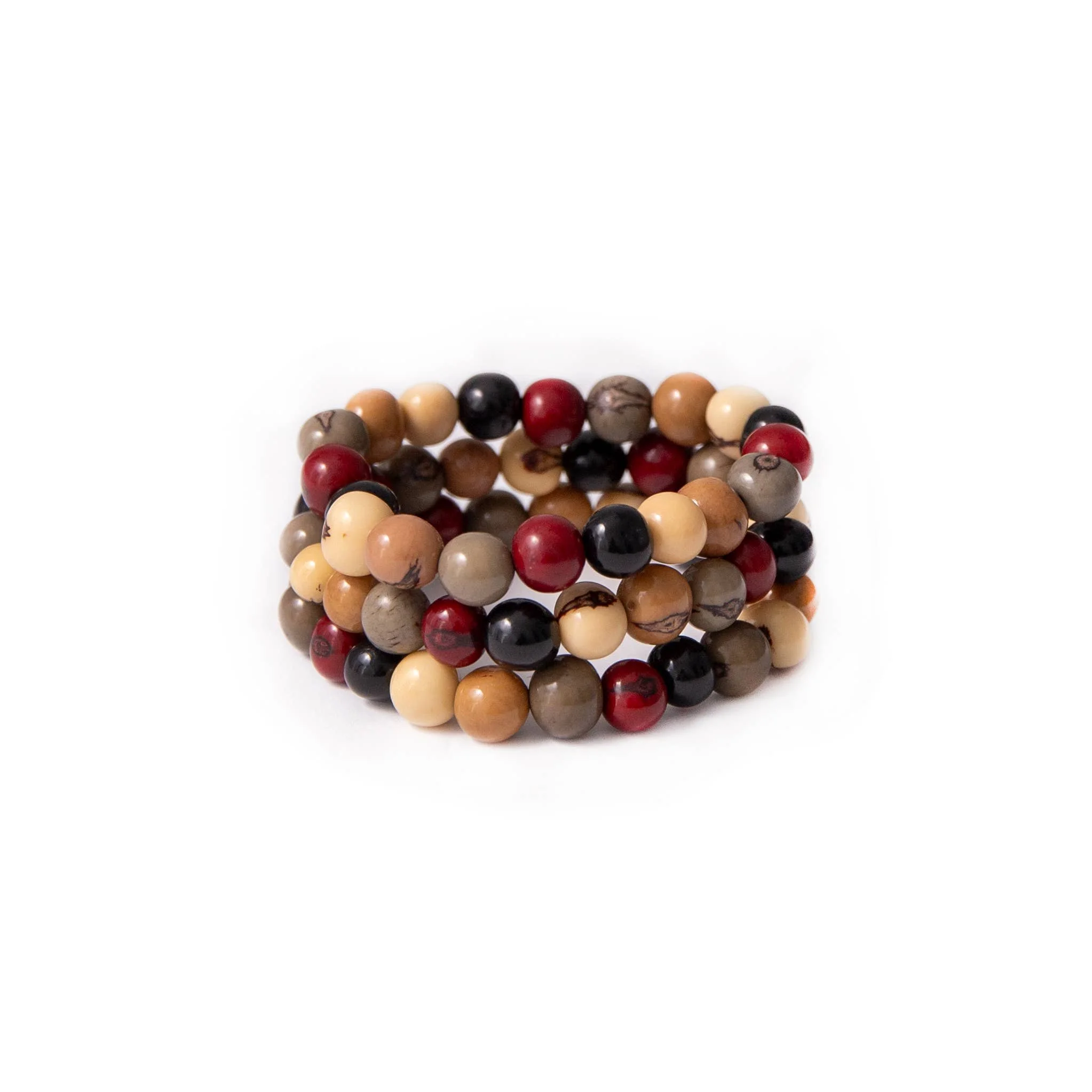 Three is always better than one! Layered acai berries make this look classic. • Lightweight. • Harvested dried acai berries. • Vegetable dyes. • Handmade in Ecuador. • Due to the nature and size of the tagua nuts, all sizes are approximate, not exact. • Dimensions: stretchable fits 7" - 7.5" wrists.