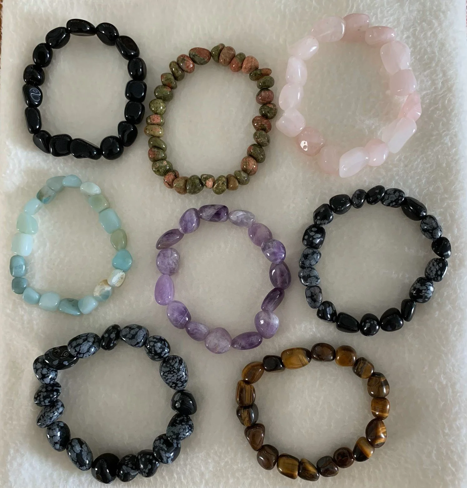 All Items › Stone Energy Bracelets Image 1 of 5 Image 2 of 5 Image 3 of 5 Image 4 of 5 Image 5 of 5 Stone Energy Bracelets $22.00 Multi-colored stones bracelets with different energies. Multi-colored stone bracelets: Black Obsidian Unakite Rose Quartz Amazonite Chevron Amethyst Snowflake Obsidian Tiger's Eye Get notified by email when this product is in stock. Quantity: Add To Cart Added! Multi-colored stones bracelets with different energies.