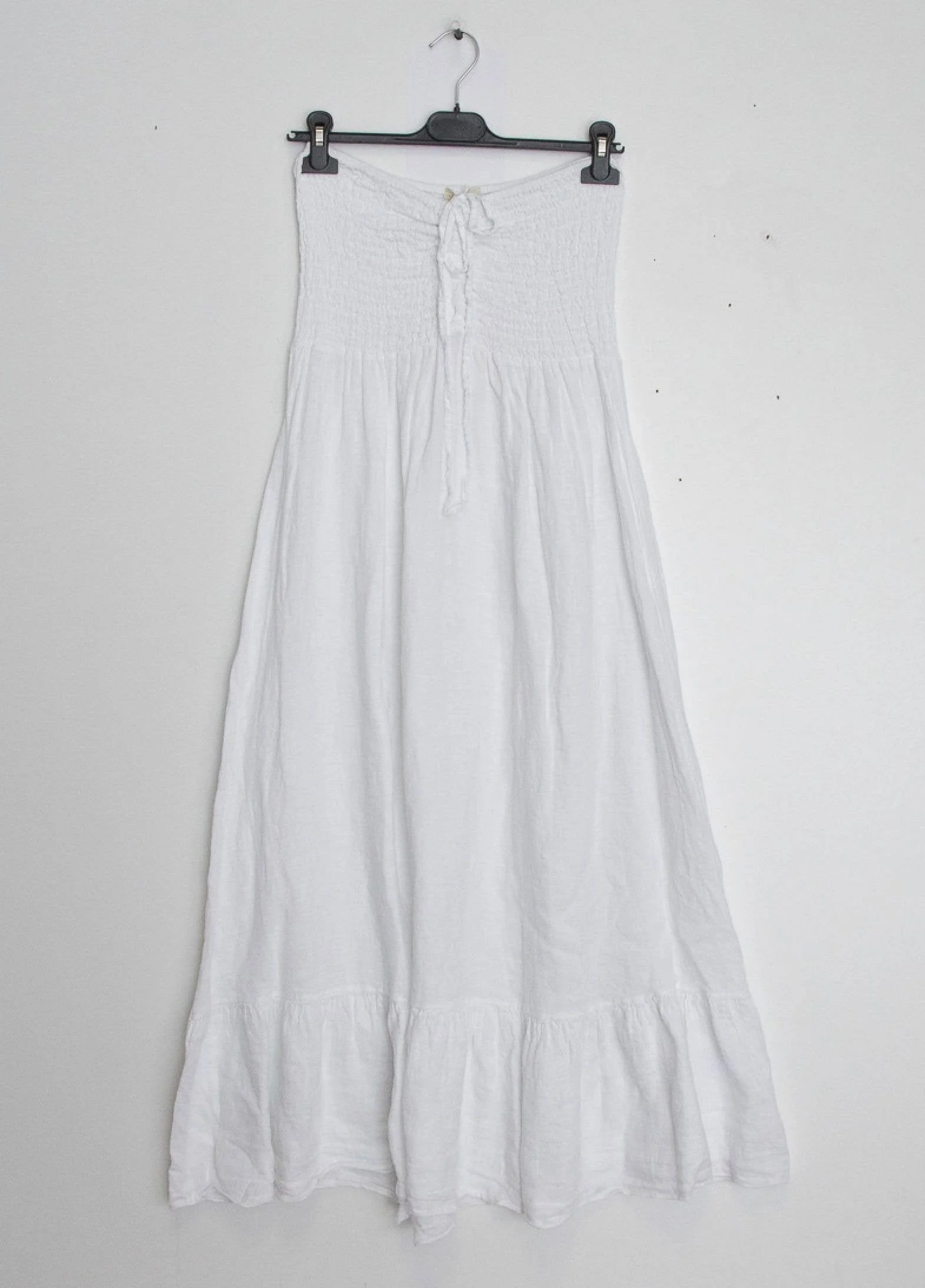 All Items › Strapless linen dress: White, One size Image 1 of 5 Image 2 of 5 Image 3 of 5 Image 4 of 5 Image 5 of 5 Strapless linen dress: White, One size $78.00 sold out Strapless linen dress with smocked chest and adjustable drawstring. One size 38-44 (M-XXL) Get notified by email when this product is in stock. Sold Out Added! Strapless linen dress with smocked chest and adjustable drawstring. One size 38-44 (M-XXL)