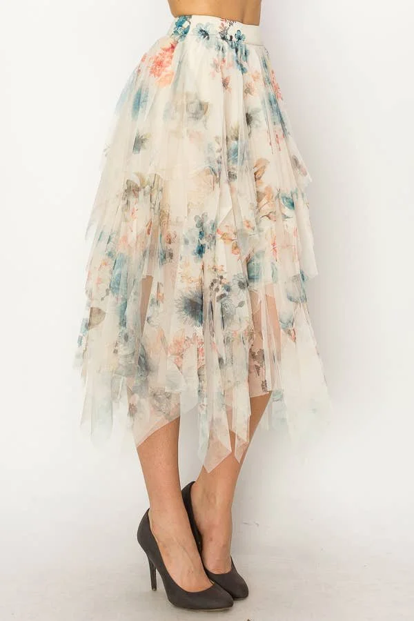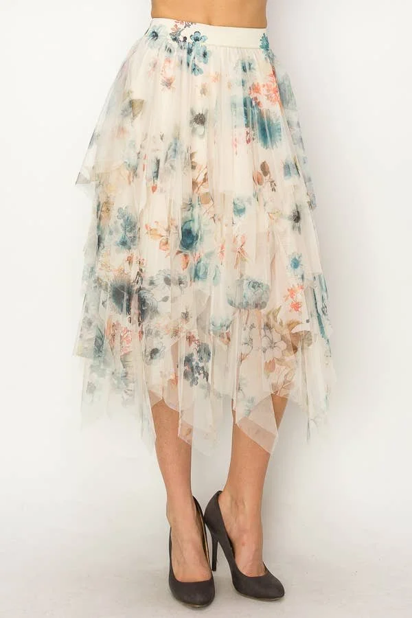 This skirt is a beautifully designed, lined tiered mesh piece with prints that will enhance any outfit. Inspired by lace and crochet, this skirt brings together classic elements and contemporary design. Perfect for the modern woman who values on-trend yet timeless fashion.