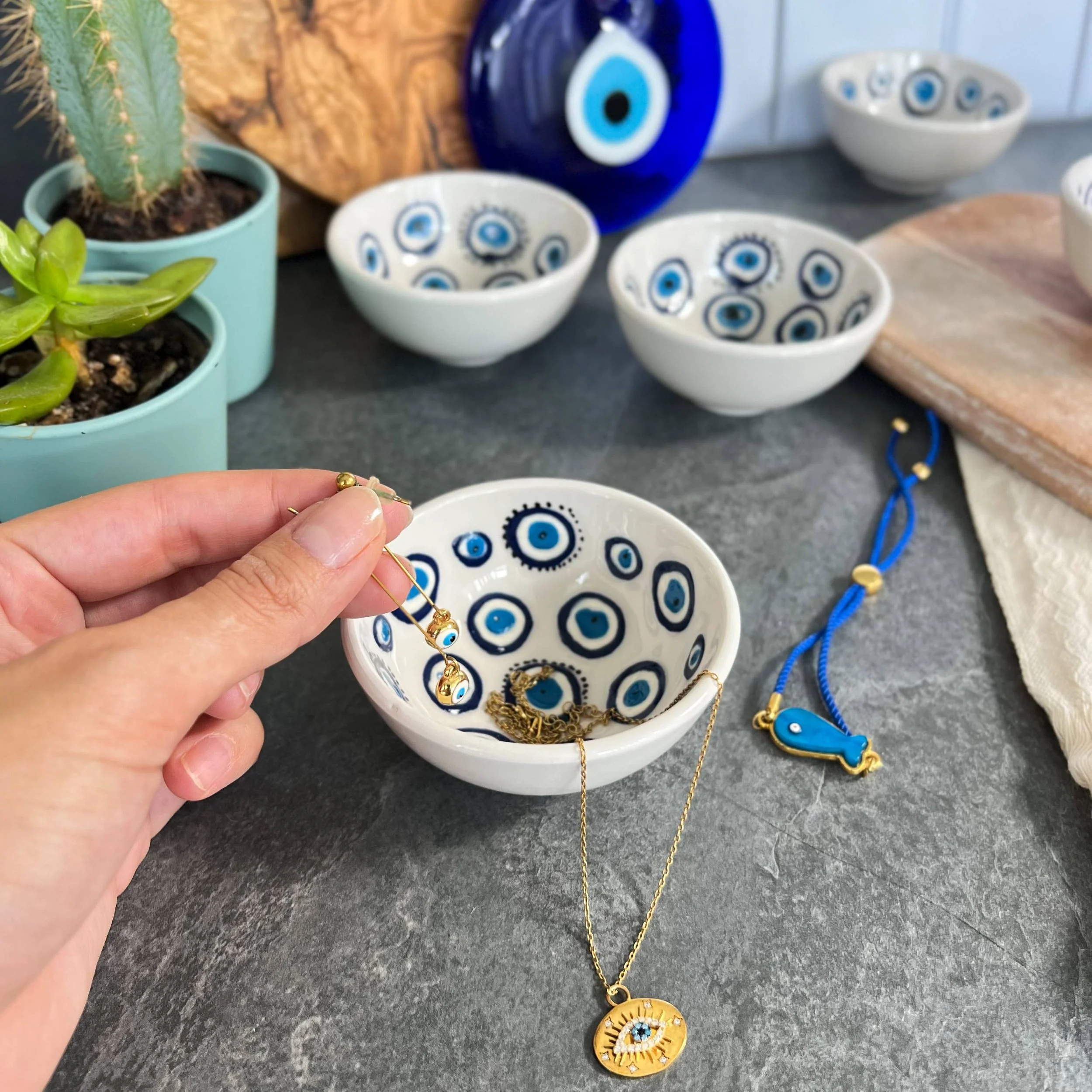 These cute ceramic bowls are handmade in Turkey. These bowls are 2" wide. They can be used for dipping sauces, nuts, cheese boards, olives in the kitchen. Also, they can be used for storing jewelry, display...