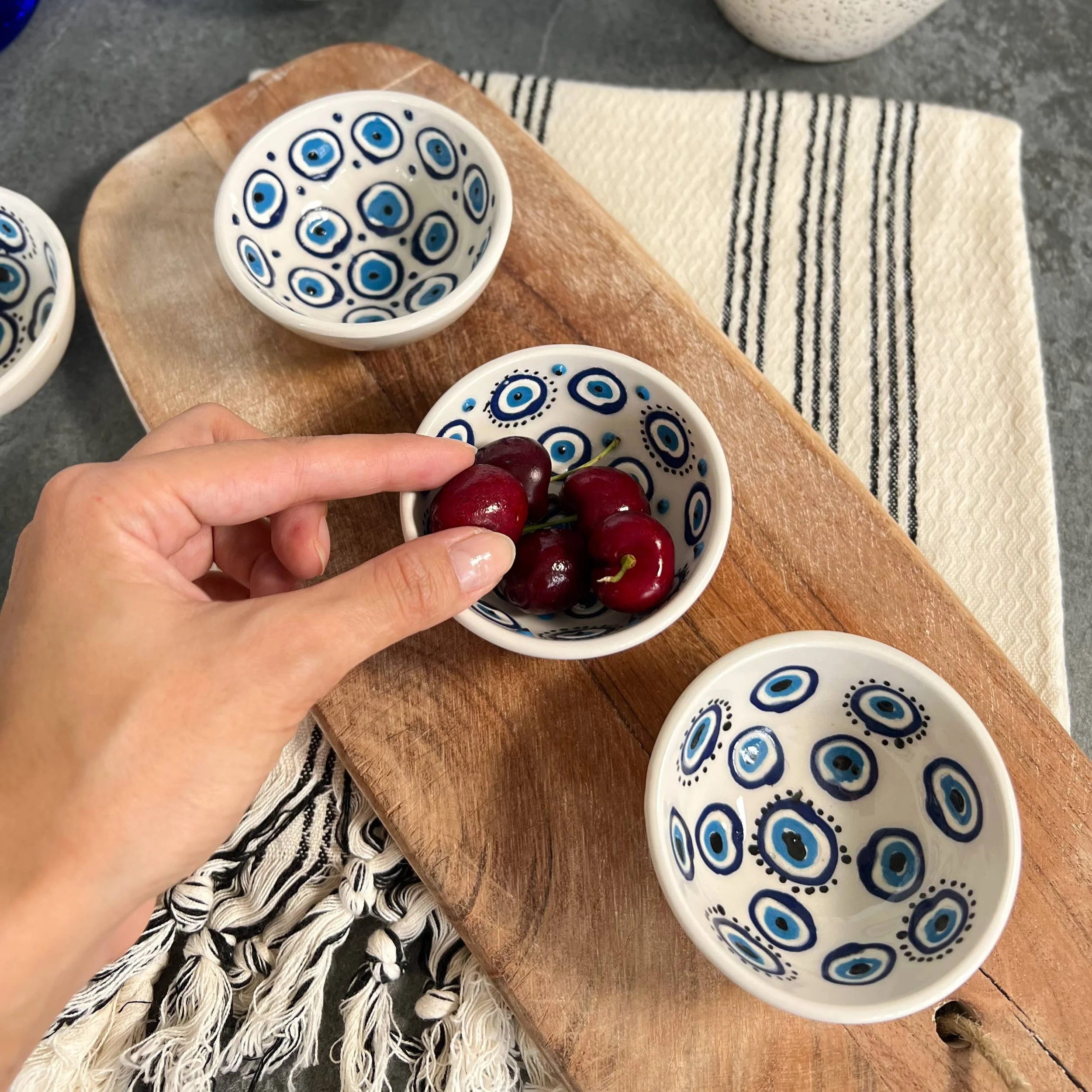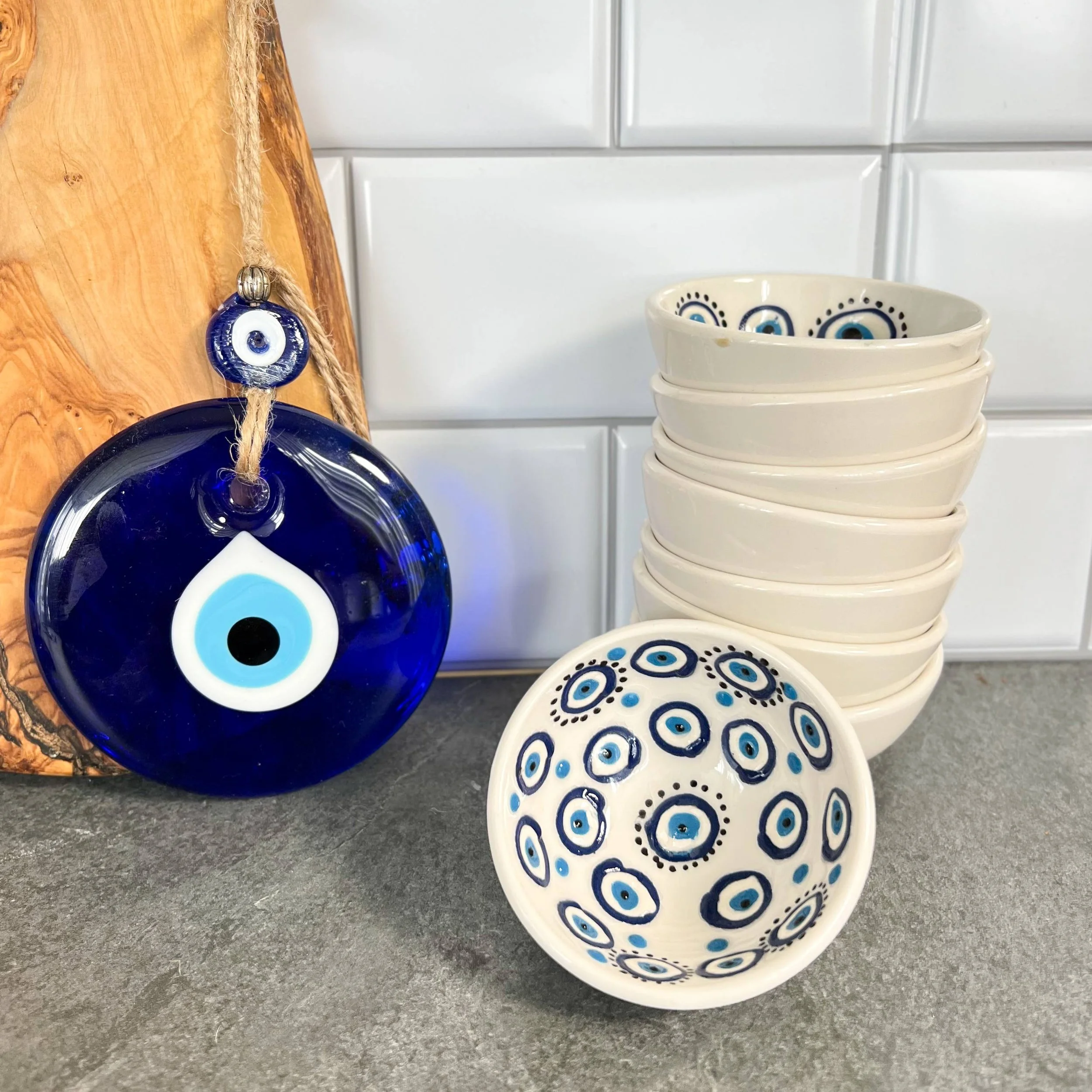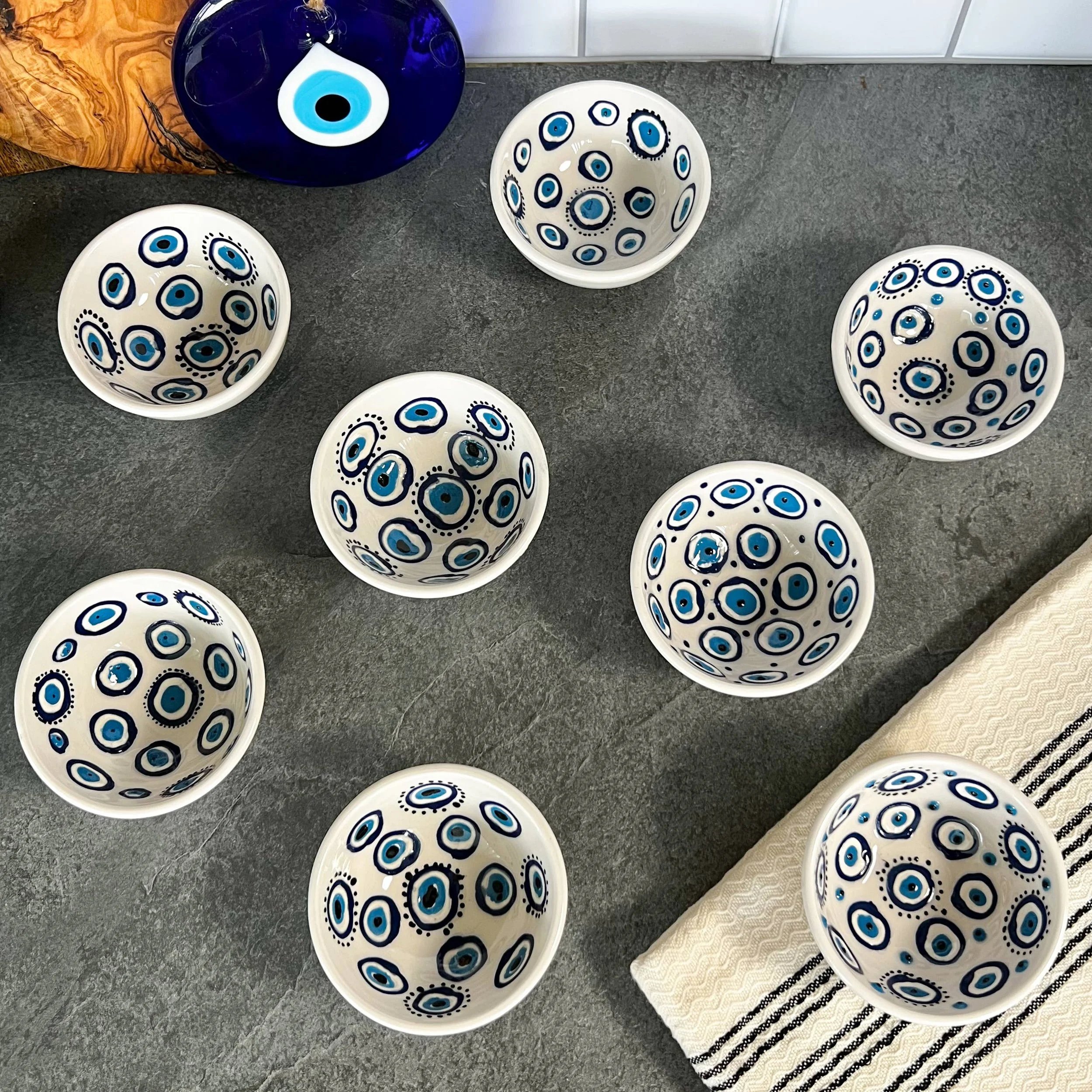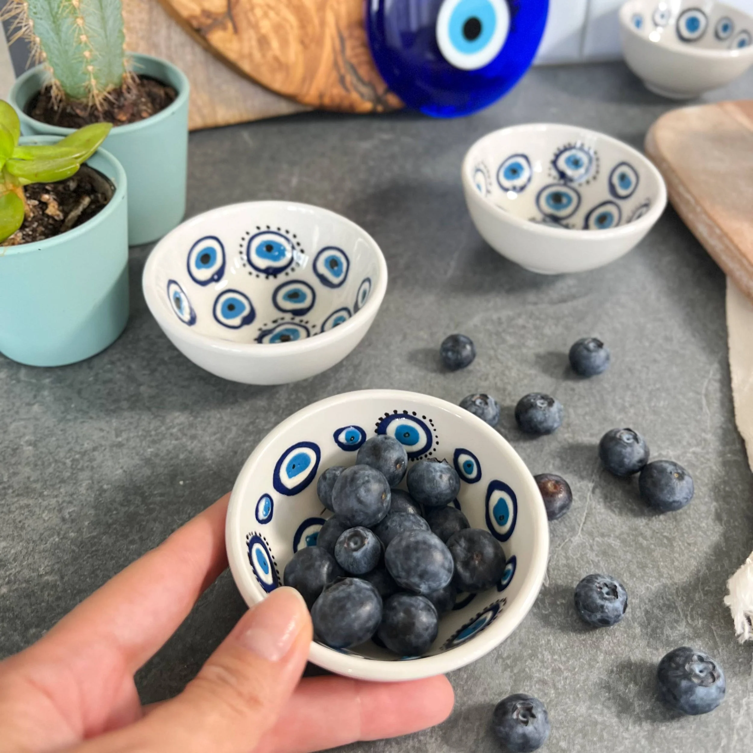 These cute ceramic bowls are handmade in Turkey. These bowls are 2" wide. They can be used for dipping sauces, nuts, cheese boards, olives in the kitchen. Also, they can be used for storing jewelry, display... They are dishwasher safe. This cute bowl will be great addition to any environment as they are unique and functional. They can be used for decorative purposes as well as serving snacks, nuts and sauces. Our ceramics are handmade that is why they are all unique and genuine. The design on them can slightly differ as they are handmade.