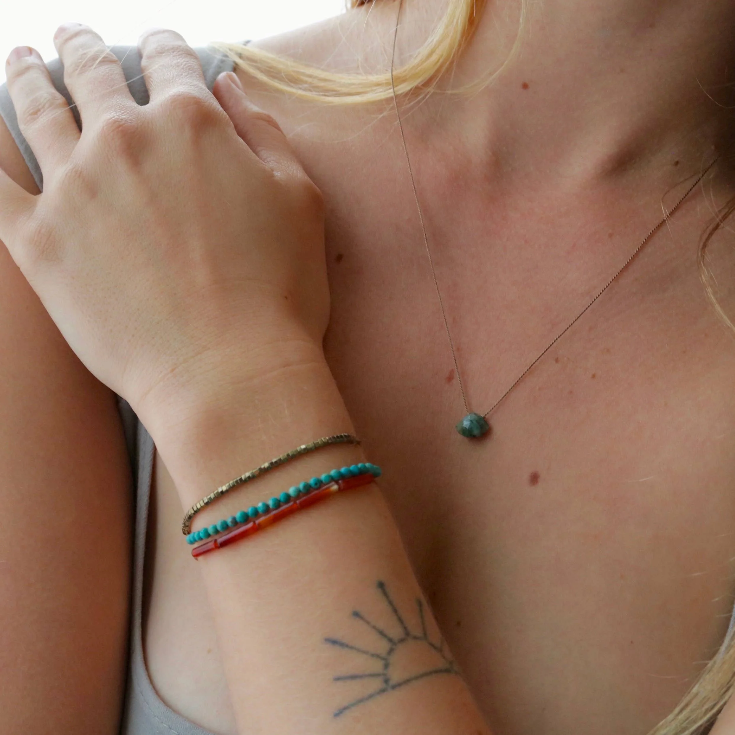 Our Nature-centric jewelry: ~ is 100% metal-free (only natural gemstones & silk) ~ fits everyone & is easy to layer (fully adjustable) ~ is artisan made in Austin, Texas ~ made with ethically-sourced gemstones ~ makes mindful gifting easy ~ features distinctive, hand-selected stones ~ comes on cards made from recycled disposable cups