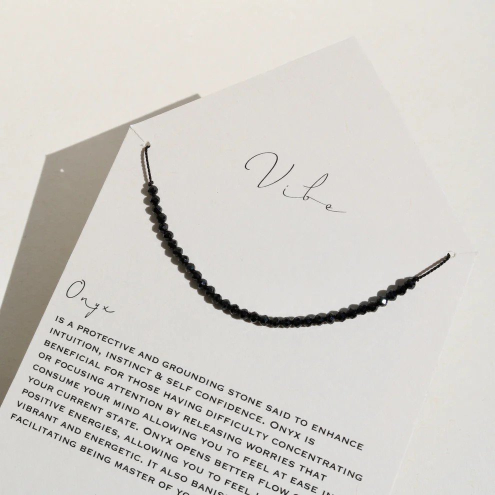ONYX & SILK NECKLACE Designed to go with the flow. Vibe necklaces give you the freedom to chose your desired length anytime, anywhere. Fully adjustable up to approximately 30" long. So, layer them up or keep it simple. Such is the beauty of natural things, each stone will vary slightly, though all will be beautiful. We promise! Vibe celebrates the intrinsic connection between humans and nature. Our limited-edition jewelry is sustainably handcrafted by a team of mindful artisans in collaboration with Mother Earth.