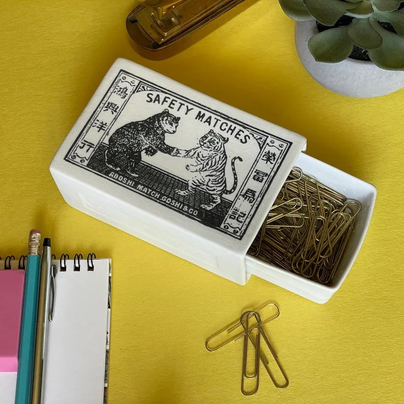 Our versatile Vintage Matchboxes are a great addition to any room. We love them as butter dishes, but they are also a wonderful matchstrike, q-tip-holder, paper clip organizer, the possibilities are endless. The prints all come from real vintage matchboxes from around the world and are hand printed in an underglaze, one side has the image forward and other side has it in reverse. Dimensions | 2"H x 3"W x 5"L Care | Dishwasher Safe *You must use Strike Anywhere Matches