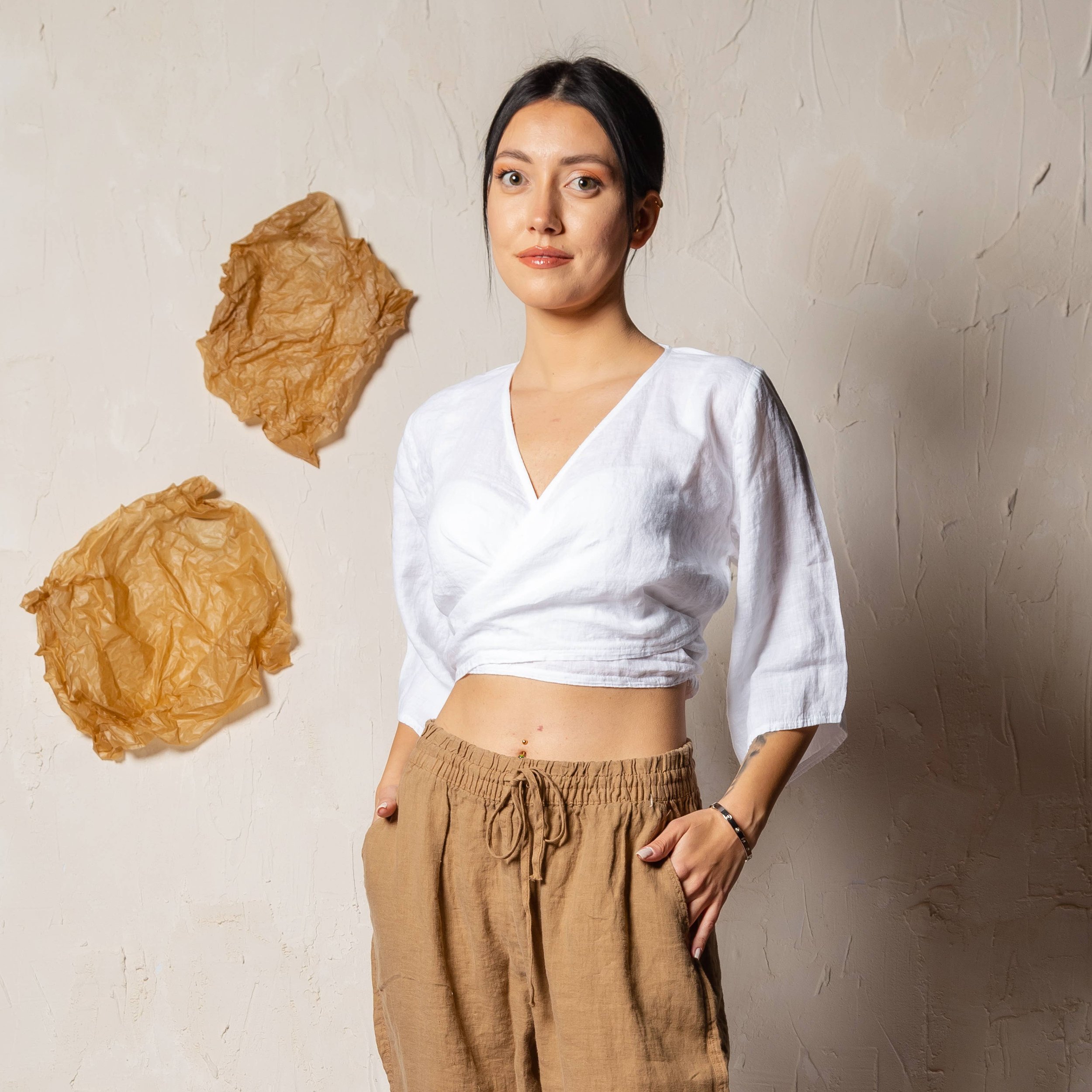 These linen crop tops can be wrapped from both the front and back, providing a versatile fit for any body type.