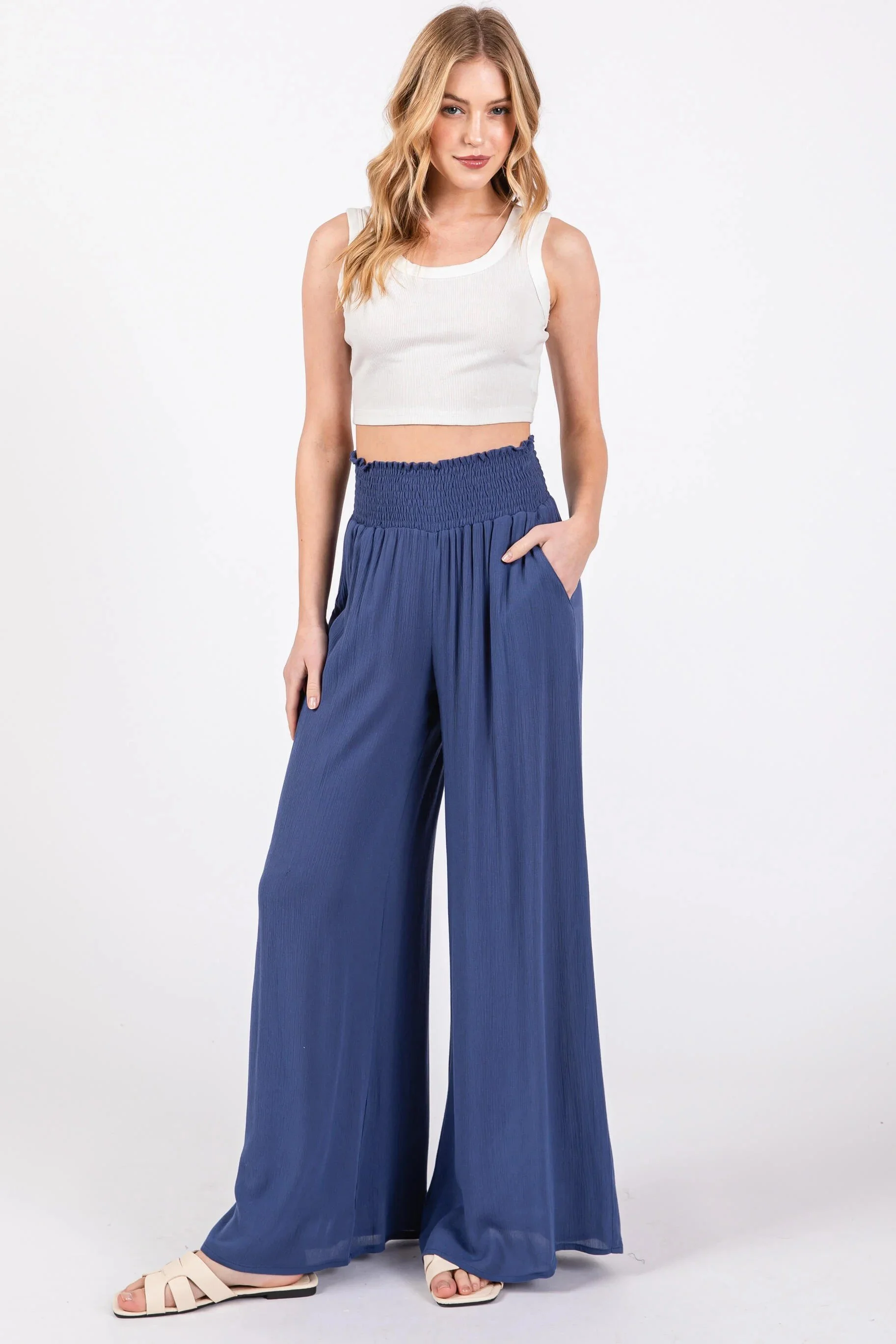 All Items › WIDE SMOCK WAIST WIDE LEG PANTS Denim Image 1 of 1 WIDE SMOCK WAIST WIDE LEG PANTS Denim $52.00 sold out WIDE SMOCK WAIST WIDE LEG PANTS.INSEAM 29"100% RAYON GAUZEMADE IN USA WIDE SMOCK WAIST WIDE LEG PANTS Denim: Small Medium Large Get notified by email when this product is in stock. Sold Out Added! WIDE SMOCK WAIST WIDE LEG PANTS.INSEAM 29"100% RAYON GAUZEMADE IN USA
